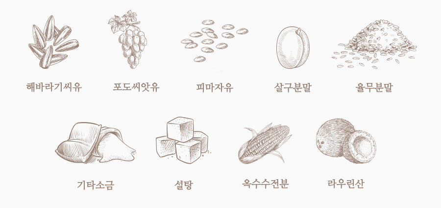 (EWG GREEN 등급 80% 이상) 팜유, 코코넛오일, 정제수, 수산화나트륨, 포도씨앗유, 피마자유, 해바라기씨유, 탄산수소나트륨, 옥수수전분, 라우린산, 기타소금, 설탕, 율무분말, 살구분말, *천연레몬껍질향, *리모넨