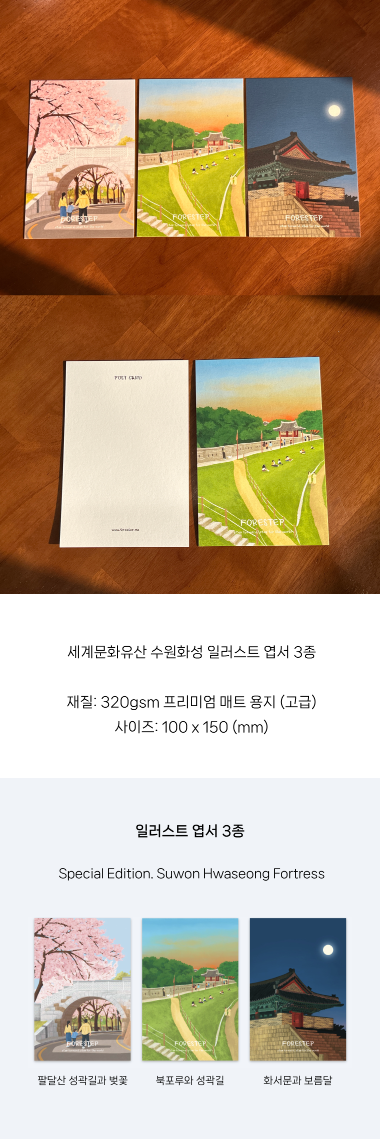 포레스텝이 직접 제작한 풍경 일러스트 엽서를 소개해요. 유네스코 세계 유산으로 등록된 수원화성의 아름다운 풍경들을 일러스트로 담아냈어요.