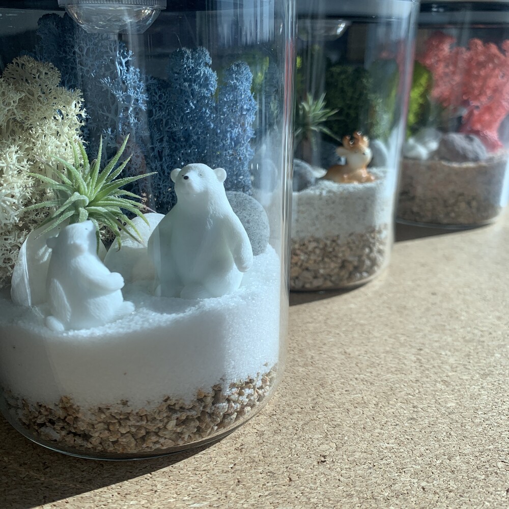 포레스텝 테라리움에 들어있는 살아있는 식물! 틸란드시아는 땅에 뿌리를 내리지 않고 잎에 붙어있는 솜털로 공기 중에 떠다니는 먼지 속의 영양분과 수분을 흡수하여 살아가는 식물이에요. 💧 틸란드시아 물 주기는 참 쉬워요. 잎 끝이 마르면 30분 정도 물에 푹 담갔다가 빼주세요.