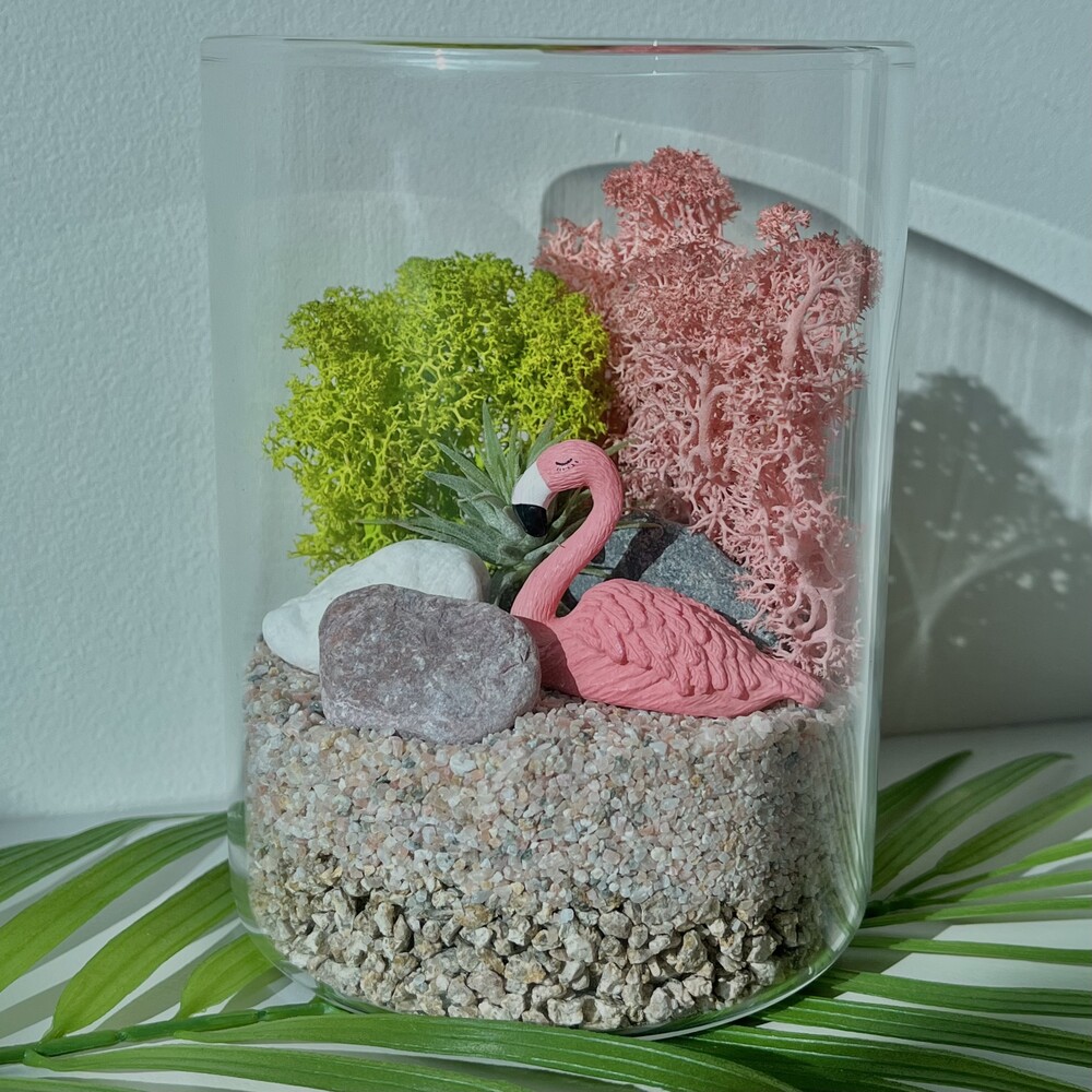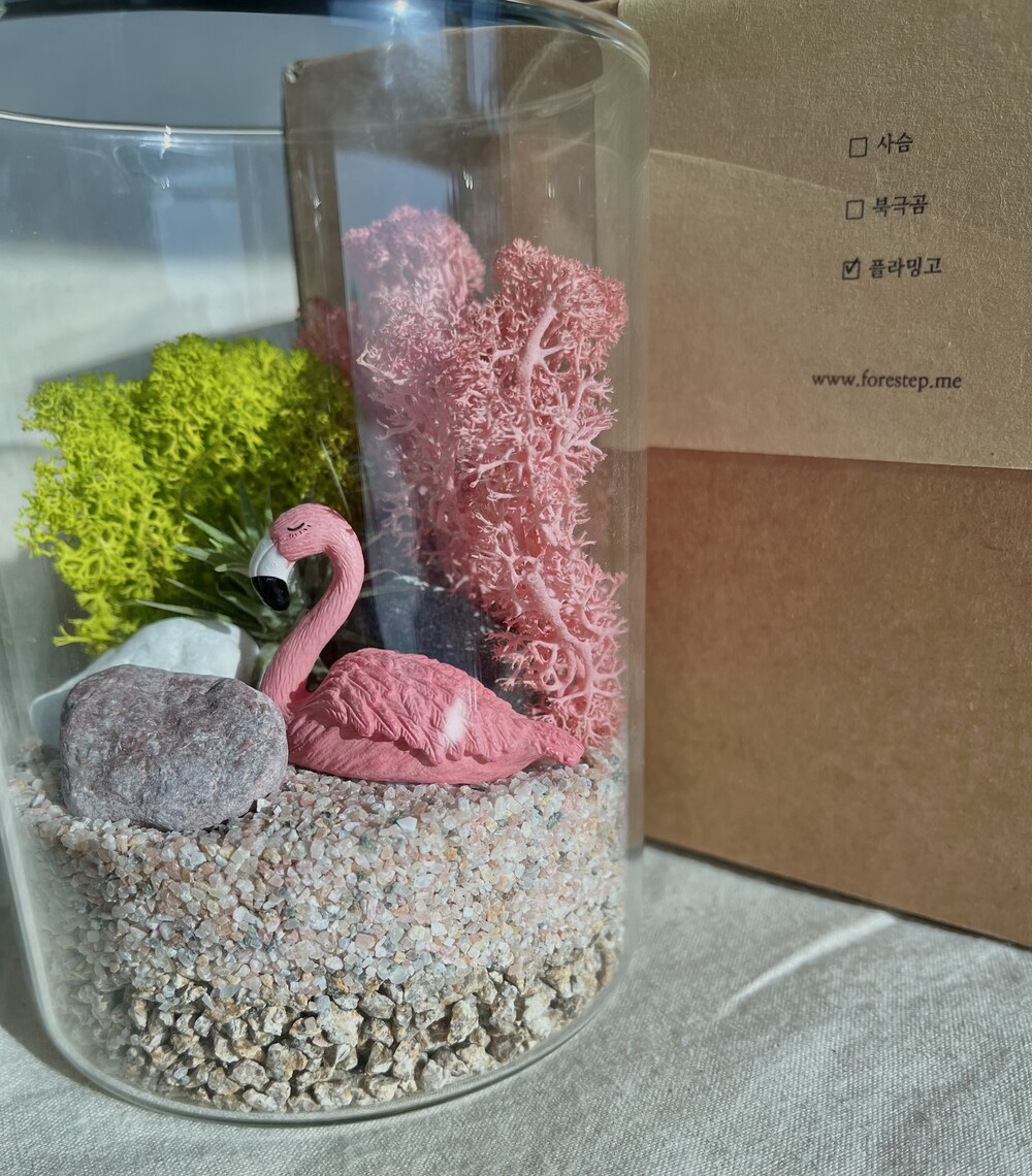 유리병 1개, 전구색 LED 조명 1개 (건전지 포함), 세척마사토 1봉, 핑크사 1봉, 스톤 3개, 스칸디아모스 2개, 플라밍고 피규어 1개, 설명서 1개