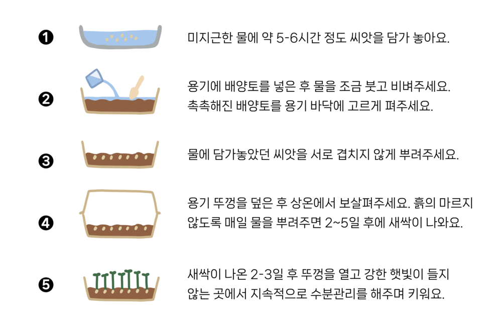 - 무순 씨앗: 엄선된 고품질의 무순 씨앗을 제공하여, 누구나 쉽게 건강한 새싹을 키울 수 있어요.